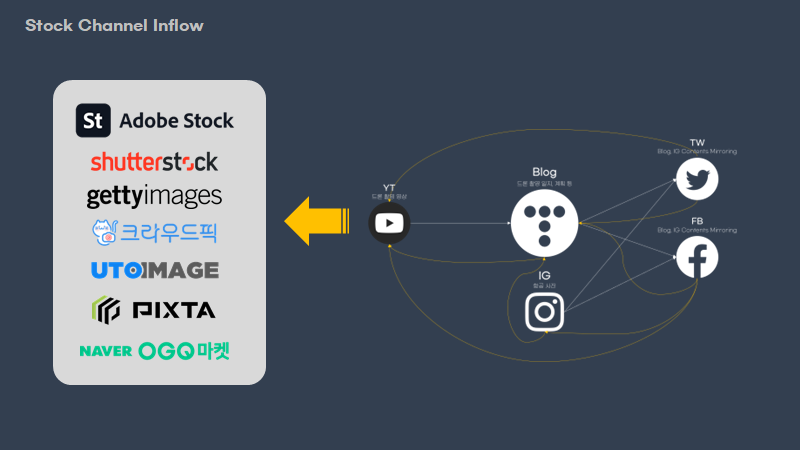 각 채널에 콘텐츠들을 게시한 후 선별된 드론 촬영 영상과 사진은 각 스톡 사이트에 등록을 한다. 스톡 사이트 선별 기준은 스톡 활동을 하시는 선배(?)님들의 수익들을 기준으로 선별을 했다. 어도비 스톡, 셔터스톡, 게티이미지, 크라우드픽, 유토이미지, 픽스타, 네이버 OGQ마켓에서 활동해보고 추후 천천히 늘려가보도록 하겠다. 기타 필요한 페이팔 비지니스 계정 등은 미리미리 준비해서 오픈했고 차근차근 각 사이트 오픈을 진행할 예정이다.