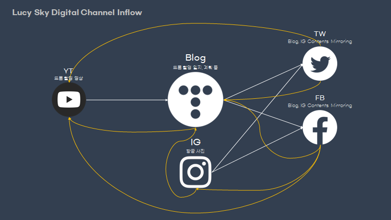 최초로 드론 촬영 계획에 대한 플랜을 블로그에서 세우고 실행에 옮겨지면 그 결과물을 유튜브에 업로드하고 다녀온 촬영 일지를 블로그 콘텐츠로 만든다. 그리고 항공 사진의 경우에는 인스타그램에 업로드를 할 것이다. 그리고 유입에 도움을 받고자 블로그와 인스타그램 콘텐츠를 각각 페이스북 페이지와 트위터에 미러링을 한다. 결국 블로그와 인스타그램을 통해 최종으로 도달하고자 하는 곳은 유튜브 채널이 되어야 한다. 그 플로우를 그려보면 아래와 같다.